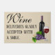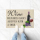 Lustiger Neuheitsfußmattenentwurf für die Weintrinker. Ausrüstungsbeschreibungen eine Flasche Wein nahe bei einem Weinglas mit Rotwein in ihm. Zusammen mit dem Weinglas und dem Wein ist Flasche eine Weintraube. Auf der linken Seite der Weinflasche und -glases ist Text im schwarzen Schriftart, der die Weinlieferungen sagt, die froh mit einem Lächeln angenommen werden. Dieser lustige und niedliche Weinneuheitsentwurf ist für die Weinliebhaber-Wohngestaltung perfekt. Macht ein großes Housewarminggeschenk.