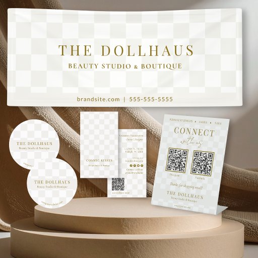 Das elegante, schachbrettgemachte Hängeschild mit goldfarbenem, elegantem Text bietet einen neutralen, bräunlichen Hintergrund. Fügen Sie Ihren Firmennamen und Ihre Tagline an die Vorderseite des Gebäudes mit einem eleganten serif Schriftart. Ihre Business-Website wird unten angezeigt. Perfekt für persönliche Marken, Boutiquen und mehr!