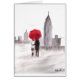 New Yorker Liebe-Paar mit rotem Schirm. Es ist ein originelles Aquarellbild von Ehepaaren in der Liebe, das von der Künstlerin Monika Howarth (ich) angestrichen wurde. Im Hintergrund ist Empire State Gebäude und New York Szene. Es ist ein regnerischer Nebel Tag in New York City.
