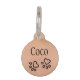 Trendy personalisierte Hund ID Tag mit einer Imitat Rose goldener Hintergrund und niedliche Herz Pfow Print Illustration. Die Vorderseite hat Platz für den Namen Ihres Welpen, während die Rückseite mehrere Zeilen benutzerdefinierten Text trägt. Netter und lustiger Anhänger für Ihr liebes Haustier.