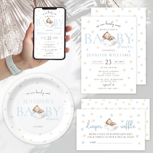 Stillose Eleganz mit unserem niedlichen Boho "We can bearly wait" Babydusche bedankt sich durch die Karte und zeigt einen charmanten Teddy, der auf einer Wolke, umgeben von Sternen, schläft. Diese ausgeklügelte Karte ist der perfekte Weg, um Ihre Dankbarkeit mit einer Touch von schönem Stil auszudrücken, und macht sie zu einer idealen Ergänzung zu Ihrem raffinierten Baby-Duschfest.
