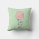 Ein Kissen mit einem knebeligen Hasen, der einen großen rosa Ballon hält, der in der Luft aufschwemmt. Set auf hellgrünem Hintergrund.