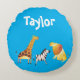 Dieses runde Kissen ist eine schöne afrikanische Safari-Szene und zeichnet sich durch einen blauen Hintergrund mit wild lebenden Tieren wie Zebra, Giraffe und Löwe aus. Passen Sie einen Namen im weißen Schriftart an. Bestellen Sie noch heute Ihr Kissen!