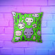 Grüner Hintergrund mit niedlichen lila Kawaii-Figuren und Lavendel-Blume auf diesem quadratischen Kissen.