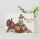 Dieser Pilger hat einen entspannenden Erntedank. Dieser Vintage Erntedank zeigt einen niedlichen kleinen Pilgerjungen, der auf einem Kürbis sitzt, einen Truthahn an seiner Seite. Der Junge hält einen Zweig von Herbstlauben.