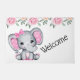 Eine willkommene Tür mit einer niedlichen pinkfarbenen Darstellung des Elefanten Aquarellbildes. Sie hat niedliche Pink-Weiß-Polka-Punkteohren und einen hübsch rosa Schleifenbogen auf ihrem Kopf. Die Decke ist mit einem schönen Rosenbukett dekoriert.