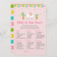 Diese eleganten "What's In Your Purse"-Karten sind ein toller Weg, um den Spaß an Ihrer Baby-Dusche zu entfachen und garantiert einen riesigen Hit zu werden! Sie können sie einfach während der Baby-Dusche weitergeben, wo es Spaß macht, die Handtaschen zu durchblättern und die Artikel, die sie von der Liste haben, auszuchecken. Die Person mit den meisten Punkten gewinnt! Das Design zeigt unsere handgezeichnete Lama und Kaktus mit farbenfrohen Fiesta Fahnen und Konfetti.