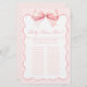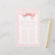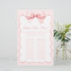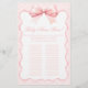 Entdecken Sie unsere charmanten und eleganten coquette-Stil Baby Dusche Baby Name Rennspielkarten. Jede Karte enthält das gesamte Alphabet zum Ausfüllen von Namen, das mit einem niedlichen rosa Bogen geschmückt ist und von einem rosa Punkt umgeben ist. Diese Spielkarten sind perfekt geeignet, um Ihren Babyduschenfestlichkeiten eine spielerische Touch zu verleihen.