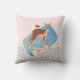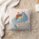 Ein Kissen mit einem hübschen, braunen Hirsch mit weißem gepunktetem Rücken. Ein kleiner Vogel sitzt auf dem Rücken des Hirsches. Ein extravagantes Blumenstrauß mit Aquarellfarben-Rose und hellolivgrüne Blätter unter den Füßen des Hirsches. Ein blaues Aquarelleck hinter dem Bild. Eine Punktgrenze am unteren Rand. Innozentes und süßes Design mit rustikaler Eleganz. Pfirsichfarbener Hintergrund