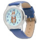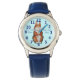 Diese originelle, trendige Kinderuhr illustriert ein niedliches braunes Kaninchen auf der Armbanduhr, der Hase hebt sich vor dem blauen Hintergrund des Uhrengesichts hervor und die Zahlen sind fett genug, um von jedem gesehen zu werden. Diese modische Uhr hat auch einen passenden Strap. Der kuschelige Hase hält einen Haufen farbenfroher Blume und er hat ein fröhliches Lächeln im Gesicht. Die niedliche braune Kaninchenillustrierung sieht großartig aus, wie diese Kinderuhr aussieht und wird Kinder jeden Alters ansprechen. Jede Frau wird diese coole und einzigartige niedliche Sonnenuhr Liebe geben. Die Uhr hat ein blass blaues Uhrengesicht und dunkelblau, leicht lesbare Zahlen. Dies ist eine anpassbare Uhr, Sie können sie mit Ihrem eigenen Text personalisieren. Das originelle, helle Bild ist in Aquarellfarben gemalt