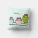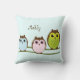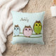 Niedliches Schlafzimmer-Akzentkissen des Kindes getan in einem hellblauen Hintergrund. Cartoongraphiken ein Blaues und ein braun, von einem rosa und von einem braun und eine grüne und braune Eule, die auf grünen Niederlassungen sitzt, verziert die Front und die Rückseite des Kissens. Personifizieren Sie den wunderlichen braunen Text für den Ihren Raum des Kindes.