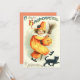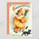 Gib diesem Halloween neben deinem Trick eine Leckerei. Dieses Bild zeigt einen niedlichen Clown, der einen lächelnden Jack oder eine Laterne trägt, einen Besen in der Hand und eine schwarze Katze an den Füßen.