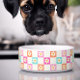 Niedlich, hübsch und farbenfroh! Diese gemusterte Hundeschüssel ist mit süßen Molkereien auf einem mehrfarbigen Chequerboard-Muster in Creme, Rosa, Orange und Türkis bedruckt.