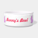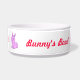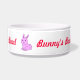 Eine niedliche rosa Häschenkaninchen-Haustierschüssel. Fertigen Sie den Text zum Ihrem Namen des Haustieres besonders an.