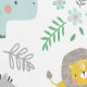 Niedliche geschlechtsneutrale Dschungeltiere in sanften Farben: Zebra, Giraffe, Löwe, Hippo mit Dschungelwüsten-Blätter und Blume auf weißem Hintergrund.