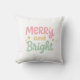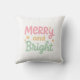Modernes Weihnachtskissen mit niedlichem und unterhaltsames Design mit "Merry and Bright" in fröhlicher Pastellrosa und grüner lässiger Schrift.