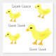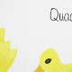 Niedliche gelbe Enten mit orangefarbenen Schnüren und Fußmustern. Quack Quack Skript Typografie vor weißem Hintergrund. Original Artwork von TamiraZDesign.