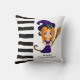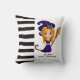 Ein Kissen mit einer niedlichen Hexe mit einem großen lila Hexenhut. Ihre schwarze Katze ruht oben auf ihrem Kopf. Sie hat langes orangefarbenes Haar und trägt einen Besen. Niedliche Cartoon-Illustration perfekt für Halloween. Der Links Rand hat schwarz-weiße Streifen.