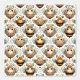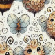 Niedliche, kartoonische Bienen mit flauschigen Körpern und kleinen Flügeln, die in einem repetitiven Design angeordnet sind. Die Bienen zeigen verschiedene Ausdrücke, mit Wirblen Antennen und weichen, abgerundeten Formen, Set vor einem hellen Hintergrund mit Spiralen und Herzen verziert.