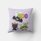 Ein Kissen mit einem schwarzen fliegenden Schläger, eine grüne Mumie mit weißem Verband und eine niedliche schwarze Katze mit einem orangefarbenen Hexenhut. Boo schrieb in lustigen bunten Briefen mit einem glücklichen Geist, der dahinter schwebte.