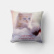 Ein Kissen mit einem Foto eines Ingwer Kätzchens, das auf einer weichen, weißen und roten Weihnachtsmannmütze sitzt. Unscharfe glitzernde Lichter auf beide Seiten. Funny pun - Meowy Weihnachten. Text ist personalisierbar, sodass Sie ihn so ändern können, dass er sagt, was immer Sie wollen.