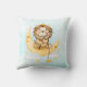 Ein Kissen mit einer niedlichen Aquarellbilder. Ein bezaubernder Löwe, der eine Kronfischerei für Sterne trägt, die auf einem Halbmond sitzen und auf einer flauschigen Wolke ruhen. Magische Fantasy-Illustration. Hellblauer Aquarell.