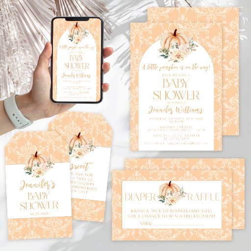 Entdecken Sie unser hübsches Buch für Babykarten, das sich ideal für eine kleine Dusche mit Kürbisgeflecht eignet. Die prächtigen, pastellfarbenen Kürbis mit niedlichen Blume und Damastmuster im Hintergrund verleihen dem Halloween-Fest eine besondere Touch Eleganz.