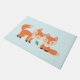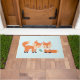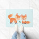 Eine willkommene Tür mit einer grafischen Abbildung von 2 orangen Füchsen sieht niedlich und glücklich aus. Hellgrüner Hintergrund.