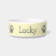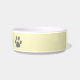 Niedliche Schüssel mit dem Namen Ihres Haustieres und einem Pfotenprint auf beiden Seiten in Grau auf pastellgelbem Hintergrund. Diese einfache und lustige Tierschale ist ein tolles Geschenk für Hunde- und Katzenliebhaber.