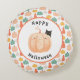 Niedliche schwarze Katze pinkelt über einem Kürbis Rundes Kissen