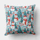 Niedliche, gemütliche Schneemänner in warmen roten Schals und warmen Strick Hüten und einem hübschen grünen, roten und blauen Kiefernhintergrund werfen Kissen.
