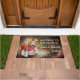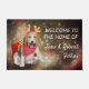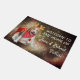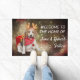Niedlicher Beagle in Anglern, die vor einer roten Geschenkboxen sitzen und den Schneefall im Licht betrachten, einzigartiges, individuelles Winterthema Doormat mit einem ruhigen, ruhigen, festlichen Gefühl.