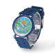 Eine niedliche Armbanduhr für Kinder, um die Zeit zu lesen. Dieser hat einen braunen Bären mit einer Angelstange in der einen Hand und einen Eimer Fisch in der anderen. Personalisieren Sie es mit dem Namen des Kindes . Wählen Sie die Farbe der Uhr oder einen anderen Stil, wenn Sie möchten. © ArianeC Illustrations-Alle Rechte vorbehalten