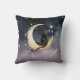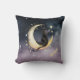 Eine niedliche Cartoon-Schwarzkatze sitzt glücklich auf einem Halbmond in einem Sternenhimmel. Ideal für Katzenliebhaber.