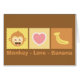 Entwurf von 3 Portokästen mit Cartoonzeichnungen eines niedlichen und glücklichen Affen, der rosa Herzform und der Banane. Text liest "Affen - Liebe - Banane". Farbpalette von Gelbem, von Braunem, Beige und Rosa macht es passend für Jungen und Mädchen. Für jedermann, das süße Tiere und goofy Entwürfe mag.