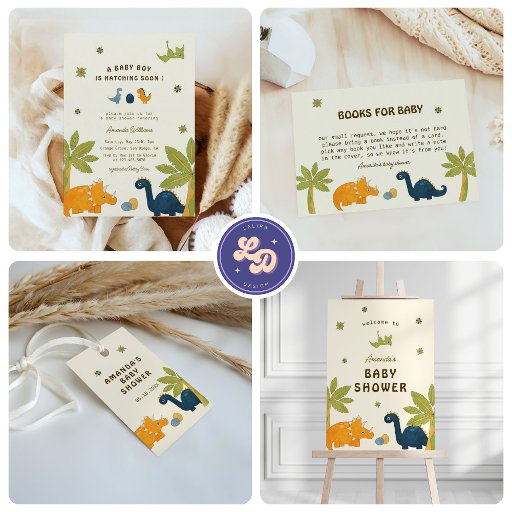 Niedliche Babydusche mit Dinosaurier im Cartoon-Stil, Palmen, Blume- und Eierillustrationen gepaart mit lustiger, stilvoller Typografie mit unterschiedlichem Hintergrund. Sie können mehr passende Artikel aus dieser Sammlung in meinem Shop finden.