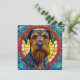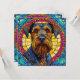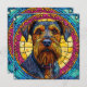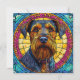 Porträt eines Hundes mit dicken, buschigen Bärten und ausdrucksstarken Augen, gerahmt durch einen lebendigen, glasähnlichen Hintergrund in Gelb, Rosa und Blau.
