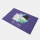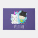 Eine willkommene Tür mit einem skurrilen Bild eines Einhorns und Vogels. Dieses Paar lächelt glücklich, während es zusammen herumhängt. Ein kleines Herz schwebt über ihrem Kopf. Unicorn ist weiß mit Engelsflügeln und einem rosa Horn. Der Vogel ist eine grünlich blaue Farbe, die eine schwarze Figur mit einer schwarzen Kätzchen mit Ohren trägt. Eine blaue Wolke stand hinter diesen glücklichen besten Freunden.