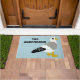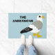 Diese personalisierte Türmatte oder Willkommensmat zeigt eine niedliche Cartoon-Darstellung einer Möwe vor einem hellblauen Hintergrund mit Ihrem Namen oder anderen Text in fett schwarzer Schrift.