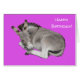 Niedliches, kleines graues Esel-Babyfoal auf einem lila Hintergrund. Der Text lautet "Happy Birthday!" auf der Vorderseite und innen "Möchte dein Geburtstag Donkeys sein!". Jeder Text kann in Wörter Ihrer Wahl geändert werden.
