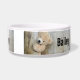 Personalisierte Haustierschüssel mit einem Lieblingsfoto eines niedlichen gestopften Bären, stehend von einer rustikalen Holzwand / Kulisse.