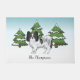 Desteis originelle Cartoon-Illustration einer Schwarz-Weiß-Farbe Papillon Rasse Hund. Der Hund ist in einer Winterlandschaft mit drei grünen Tannenbäumen und fallendem Schnee untergebracht. Der Hintergrund ist ein blaues bis weißes Gefälle, das das Design des kalten Wintertages verleiht. Es gibt auch einen personalisierbaren Textbereich für einen Namen.