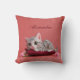 Eine niedliche, graue und weiße Cartoon-Tabbattacke liegt auf einem Kissen mit rosa Nelken in der Nähe.