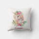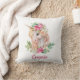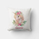 Adorable, mädchenhafte Einhorn mit rosa Blume auf dem Kissen des Dekorateurs. Personalisiert mit einem Namen in einem niedlichen Skript-Schriftart.