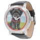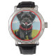 Niedlicher schwarzer Hund mit rotem Kollar im Cart Armbanduhr
