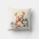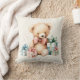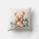 Ein Kissen mit einer niedlichen Abbildung mit einem Viktorianischen Teddybär. Tragen eines extravaganten roten Bogens. Gezeichnet in einem niedlichen altmodischen Vintagen Stil. Rote und blaue Pastellgeschenke umgeben diesen herzhaften Bären.