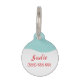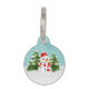 Dieses festliche Begleiter-Tag zeigt Desteis Cartoon-Illustration eines niedlichen Schneemanns. Der Schneemann trägt einen roten Hut und einen Schal mit rot-weißen Streifen. Seine Nase besteht aus einem orangefarbenen Karotten und seine Arme sind aus braunen Stöcken. Hinter dem Schneemann stehen zwei Tannen mit Schnee. Die Hintergrundfarbe ist aquamarin mit einem Punktmuster als fallender Schnee. Auf der anderen Seite gibt es personalisierbare Textbereiche für den eigenen Namen des Tieres und für die Telefonnummer des Besitzers.