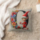 Niedlicher Weihnachtself in festlicher Kleidung mit einem monogramm Buchstaben O mit Blumendekor und Imitaten, einem hellen Lederhintergrund.
