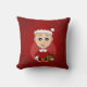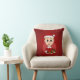 Kissen mit einem niedlichen, lächelnden Kaukasier mit kurzem blondem Haar, trägt der Junge ein Weihnachtskostüm mit einem roten Hut und hält ein Geschenk; in einem roten Kreis auf einem roten Hintergrund ein Weihnachtsferien Cartoon Design