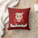 Das Kopfkissen mit einer Abbildung eines niedlich lächelnden Kaukasierjungen mit kurzem schwarzem Haar trägt der Junge ein Weihnachtskostüm mit einem roten Hut und einem Geschenk; in einem roten Kreis auf einem roten Hintergrund mit einer bearbeitbaren Textvorlage für Ihren Namen oder Ihre Nachricht.
